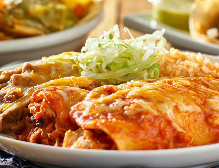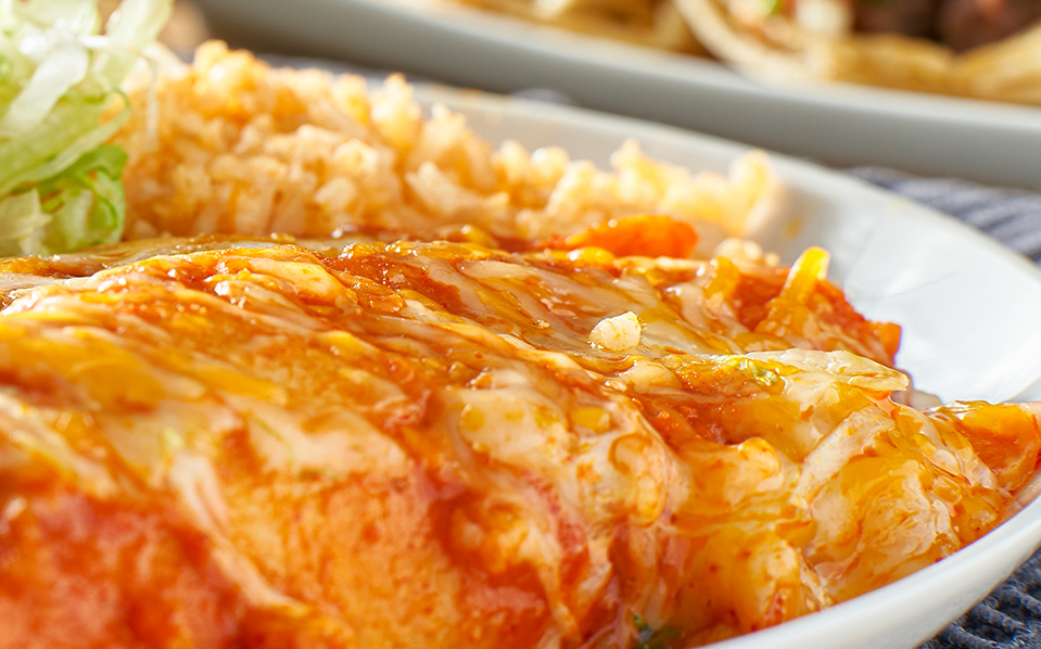 One burrito with grilled chicken or steak, cooked with red and yellow peppers, onions and tomatoes topped with cheese sauce. Served with crema salad and your choice of rice or refried beans.